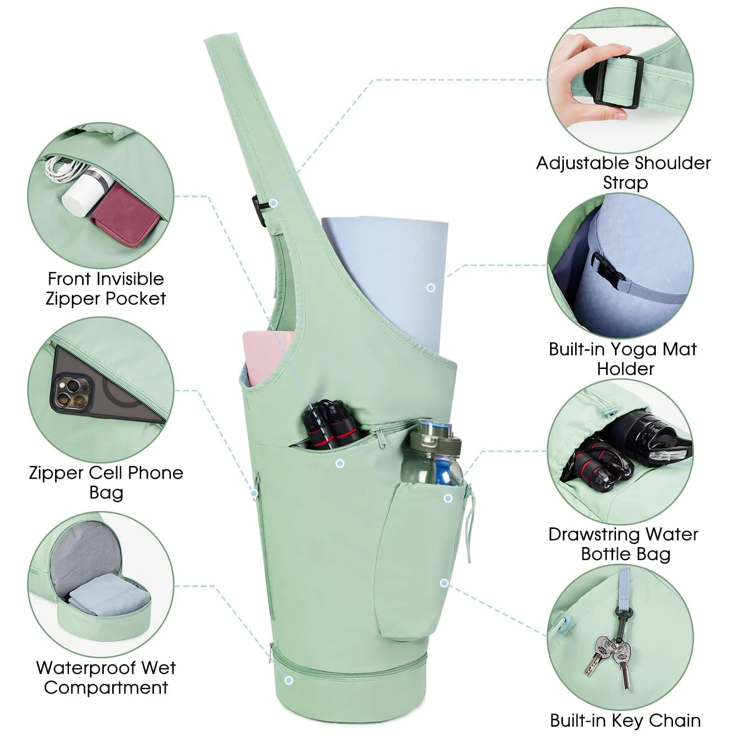 Yoga Mat Bag, Large Opening Long Tote Yoga Mat Carrier Holder Bag with Waterproof Wet Pocket and Drawstring Water Bottle Pocket, Adjustable Shoulder Strap Storage Bag